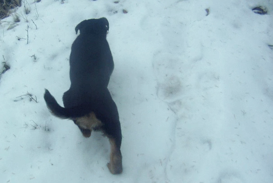 The weather had finally gotten mild, and Sitka and I were on our fourth day in a row of making our daily forest rounds. On the colder days Sitka spent a lot of time complaining, especially during the latter half of our walks. Today however, she was supercharged and enthused, snuffling through the snow banks on a continual mission of discovery.