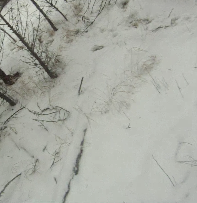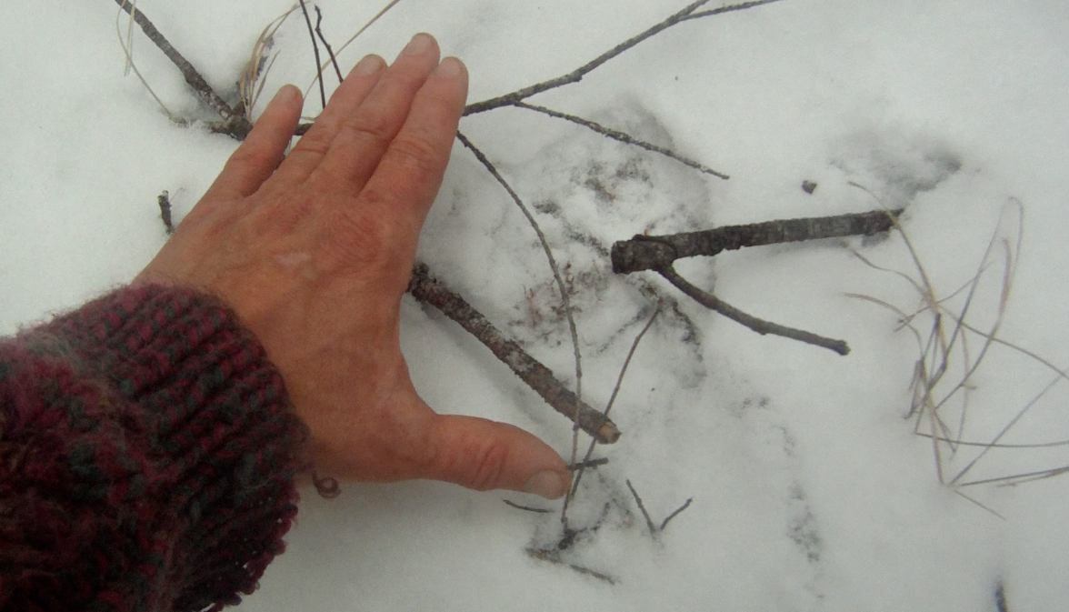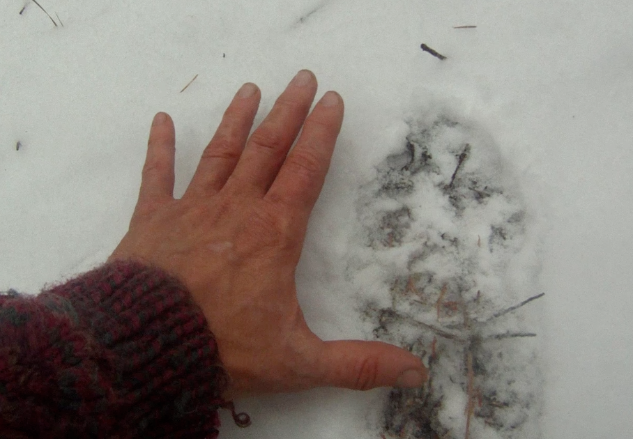 I’m holding the camera a bit crooked here, but the point is to show the distance between leaps of this incredible creature. There was on average 10 or 12 feet between each set of prints. This cat moved swiftly, silently and with perfect grace.