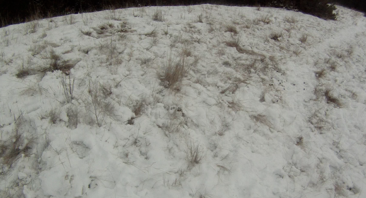 The open fields are covered in a thick blanket of snow, mostly undisturbed. Footprints and tracks of various kinds criss-cross the path here and there. But in select places there is undeniable evidence that Wapiti has been feeding. The snow is disturbed, the grasses churned up and grazed.