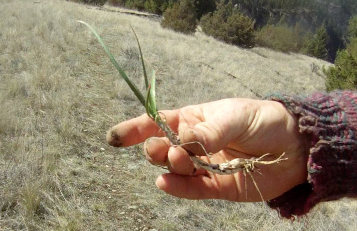 The Mesa is also revealing a shocking proliferation of wild onions. I’m learning that in the earliest part of spring they’re really easy to spot because the underground bulb which overwinters is filled with energy which sends up numerous green shoots as soon as the ground thaws. I was actually looking to see if the wild tarragon was beginning to regrow, but found numerous onions instead.