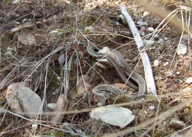 First snake of the season! And this was Sitka’s first encounter with Snake… ever! She found him on the hillside heading up the mountain at the beginning of our walk. I had been wondering how Sitka might react to critters like Snake even as I observed her leap suddenly away from the patch of ground beside the trail she’d been examining. Lo and behold, there was Snake!