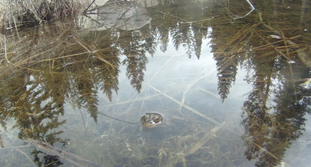 Next, as we approached the swamp, two ducks flew up from the place where the clutches of frogs’ eggs awaited the warming weather. I was glad to see that the eggs were undisturbed… and that mama frog was settled in amongst them.