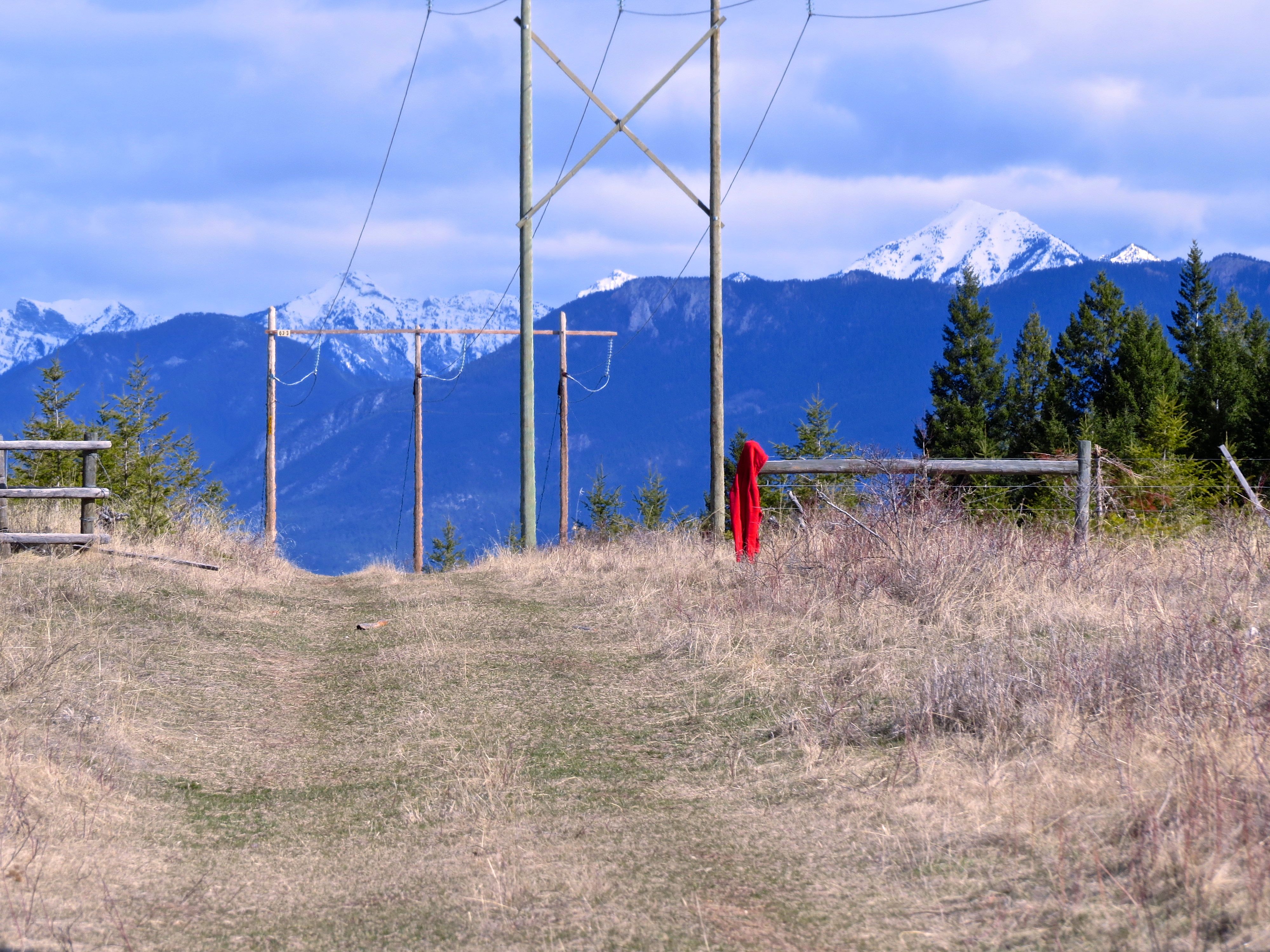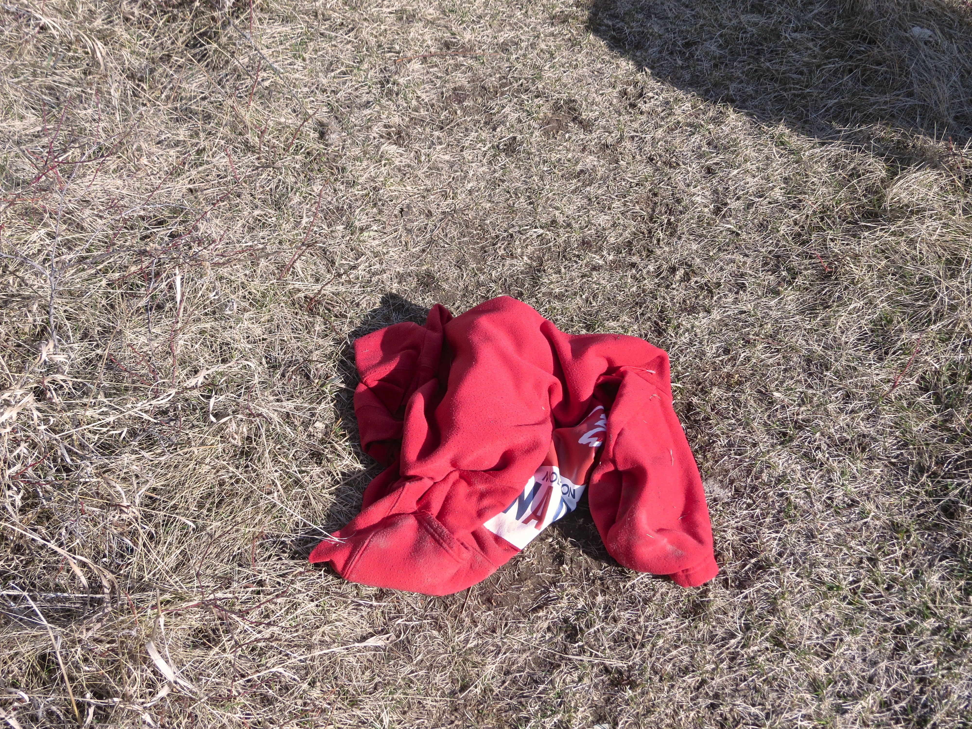 Shortly thereafter, we cautiously approached something lying out in the open field, heaped and bright red. It was fun to watch Sitka approach with extreme caution even after I’d identified the anomalous thing.