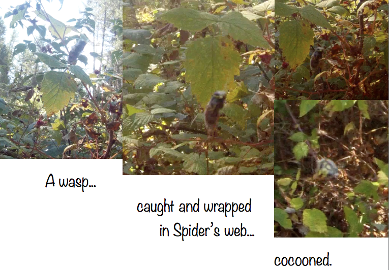 I had noticed this spider web erected in a raspberry patch I frequent. Daily I would check to see who was on the menu. Finding this wasp fully cocooned but as yet uneaten was a bit unnerving. I haven’t met this particular spider face-to-face, but she must be a formidable creature! And dedicated readers of The Daily Forest report may recall that it was Wasp who originally initiated me into Forest Life with a quick sting to the back of my hand. The message today is predominantly about relationships.